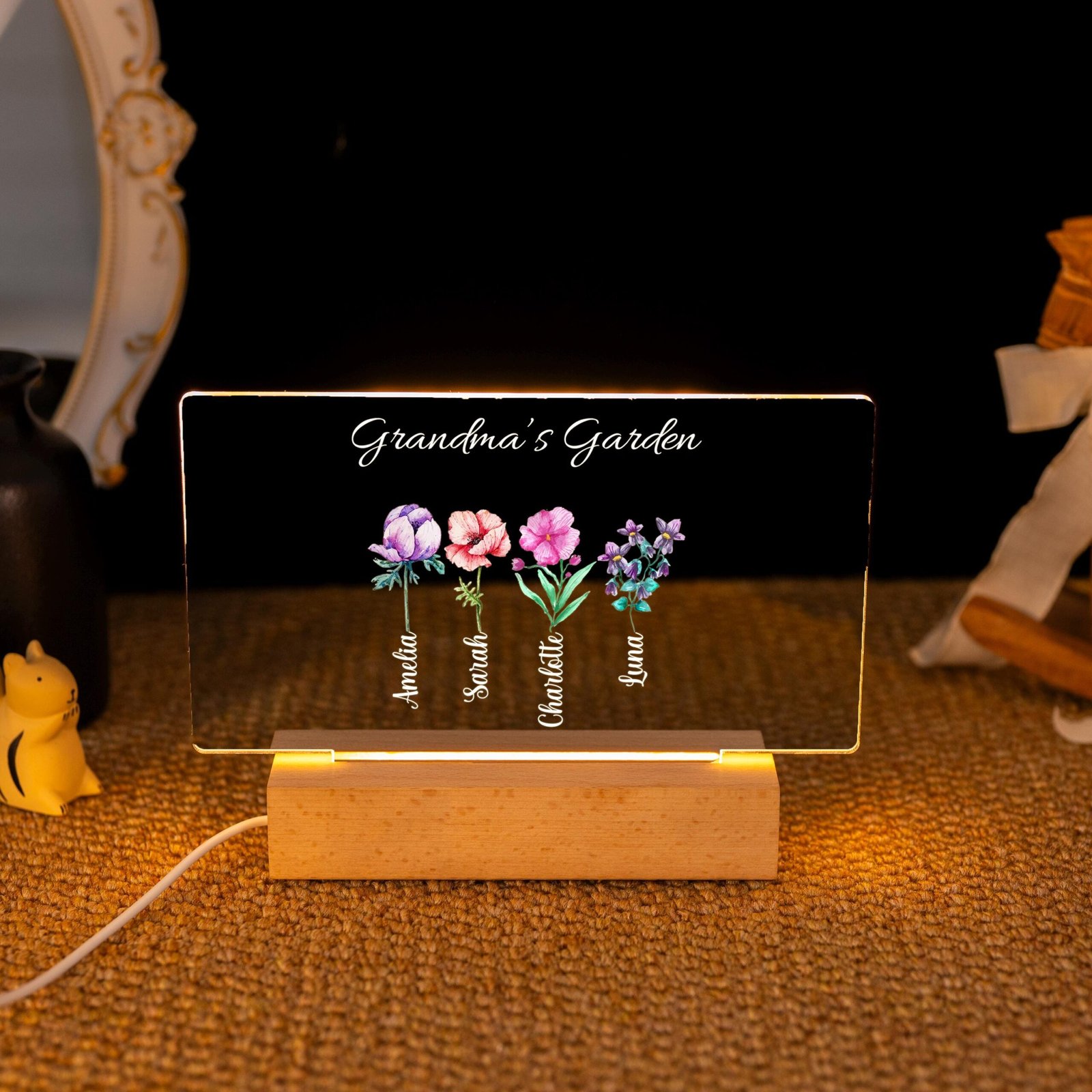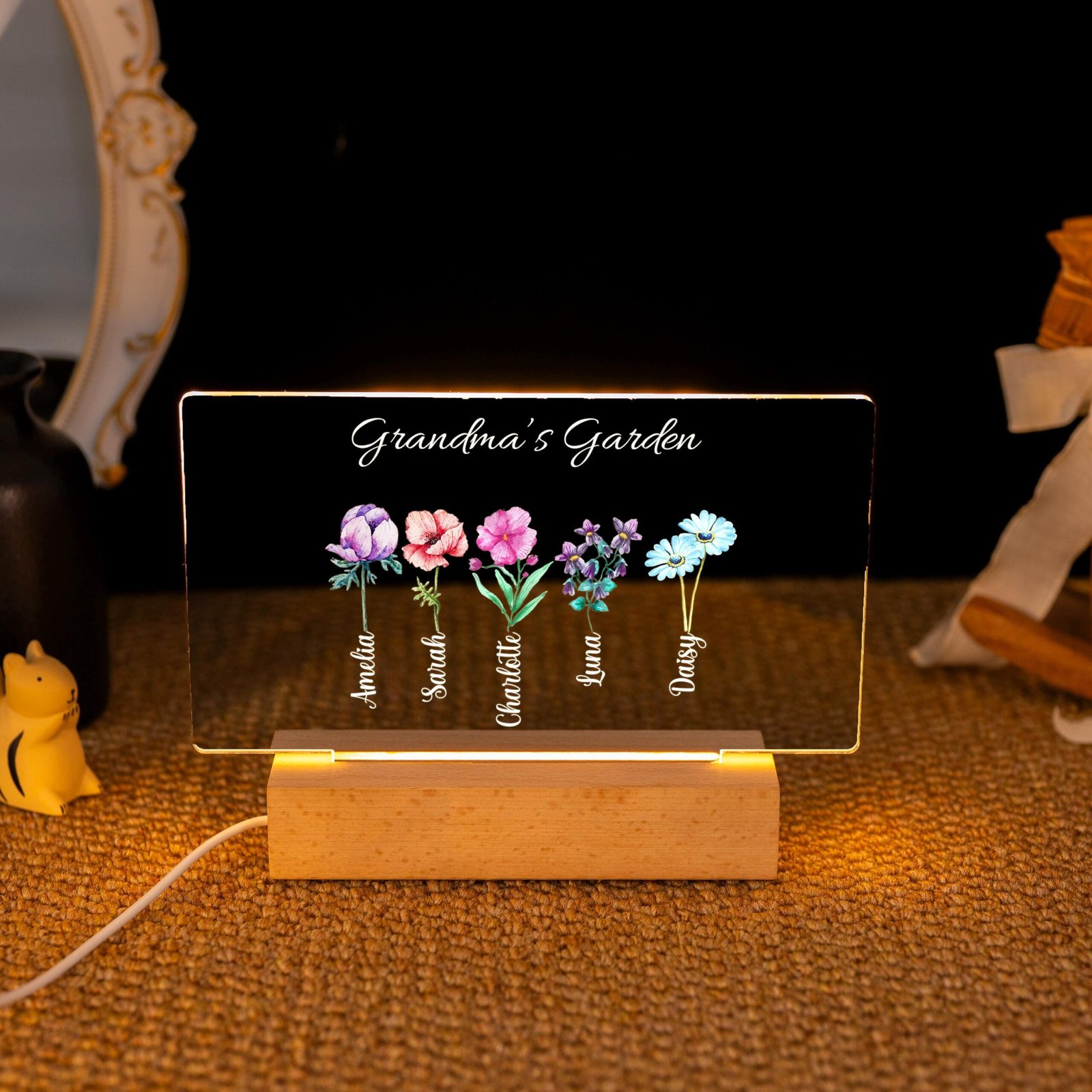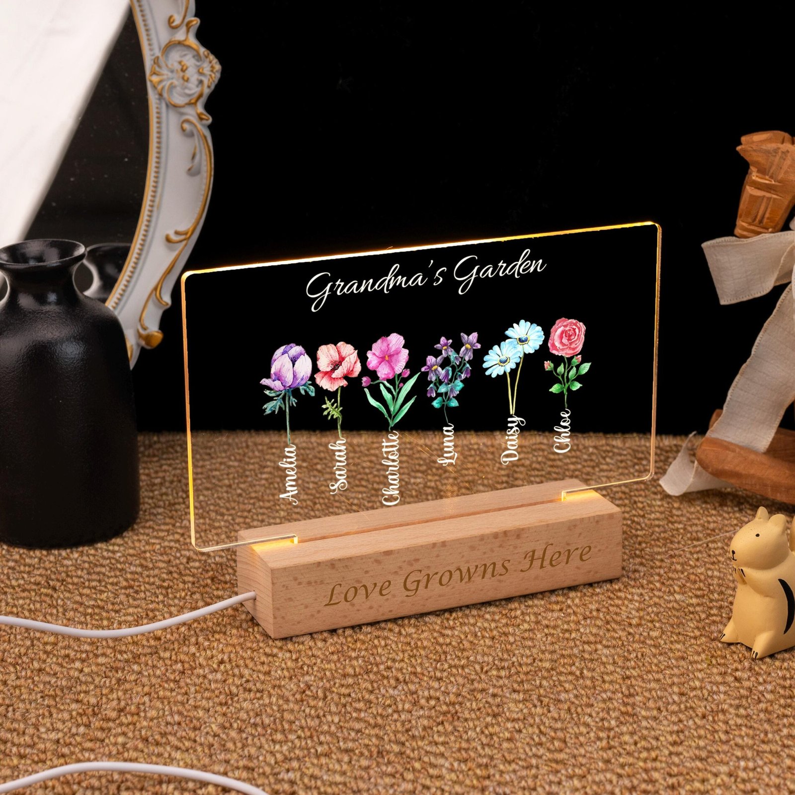The Custom Grandma‘s Garden Birth Month Flowers keepsake is a heartfelt way to celebrate family bonds through the symbolism of birth flowers. Designed as a beautifully engraved acrylic LED night light, this piece showcases each family member as a flower blooming in Grandma’s “garden of love.”