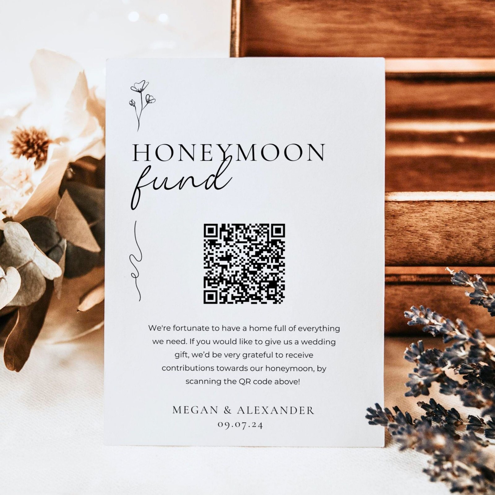 Ready to revolutionize your wedding registry? Introducing our Custom Honeymoon Fund QR Code Sign – a contemporary and stylish solution for couples looking to streamline their gift registry while embarking on their post-wedding adventures. Elevate your wedding experience with this modern cash gift option that adds a touch of sophistication to your celebration.