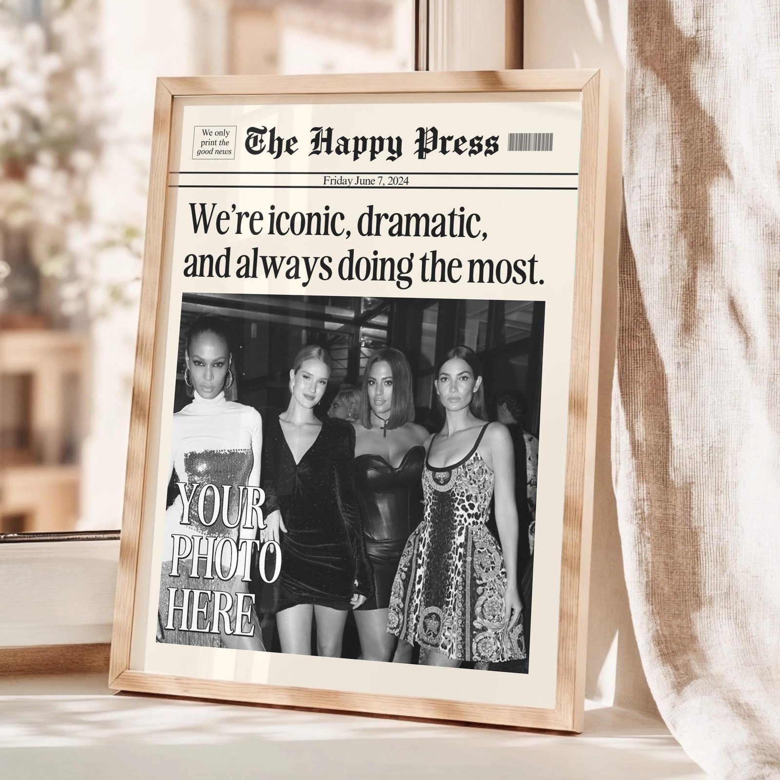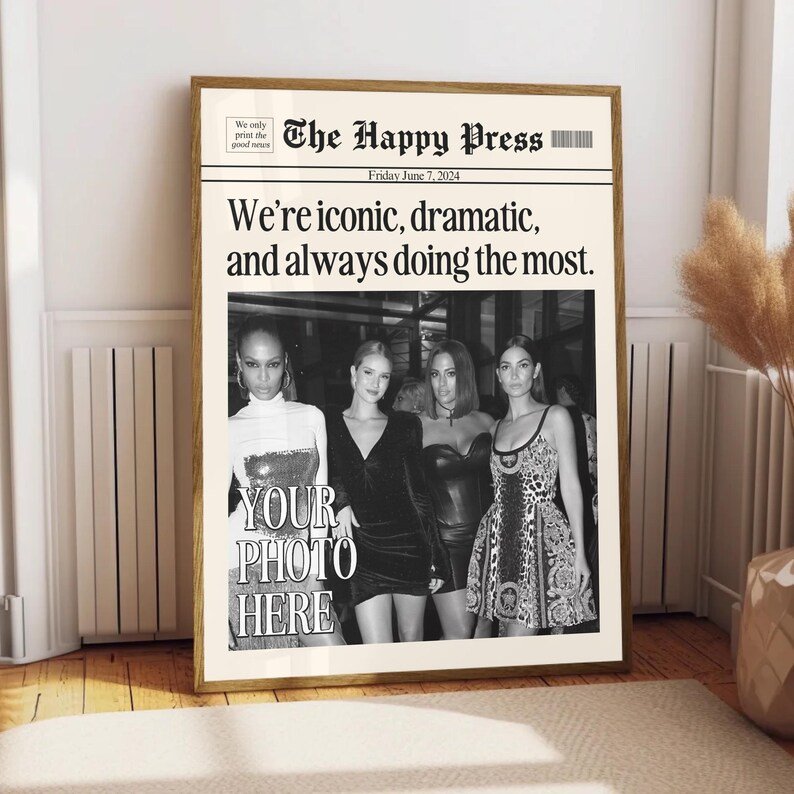 Make your memories timeless with this vintage-inspired custom newspaper print! Whether it’s for your dorm, living room, or as a heartfelt gift, this print will elevate any space with a unique personal touch. Upload your favorite photo, choose your headline, and let me create a piece that feels straight out of a classic newspaper!
