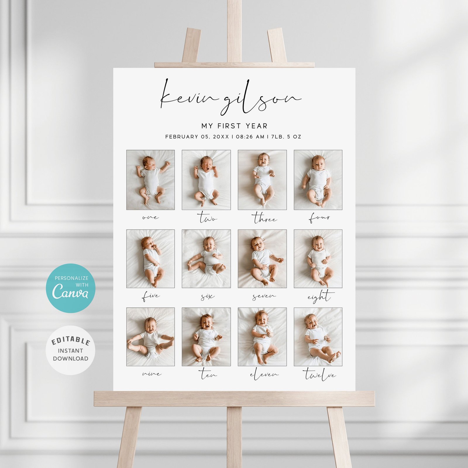 - Modern, Minimalist Design A clean layout with elegant fonts and simple icons ensures the attention stays on your baby’s milestones, making it perfect for any gender or party theme.