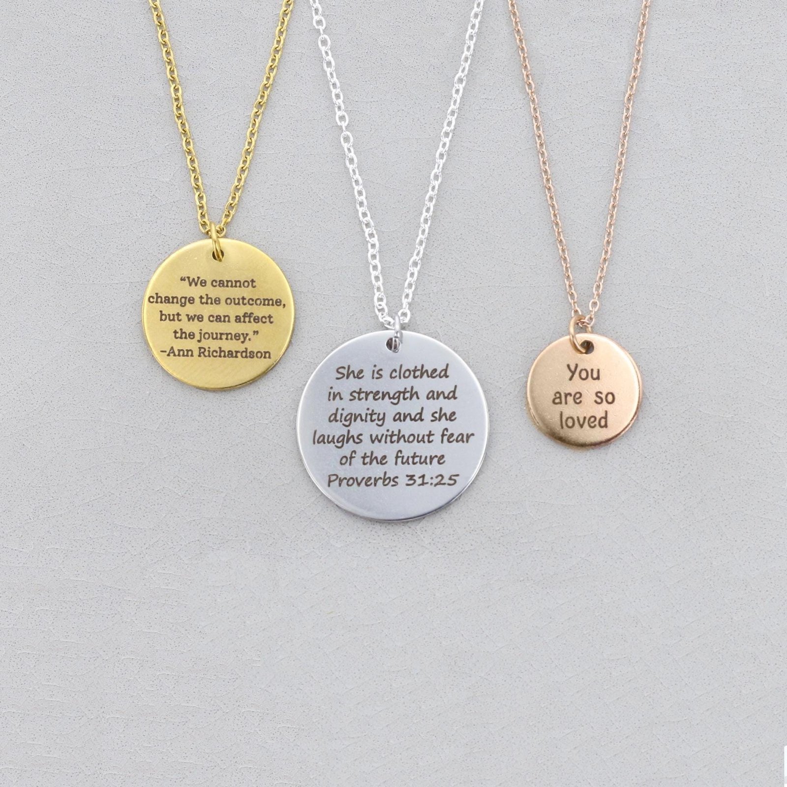 Whether it’s a life mantra, a comforting Bible verse, your wedding song lyrics, or a quote that fuels your ambition, our Personalized Mantra Scripture Verse Book Song Lyric necklace transforms those powerful words into a personal keepsake. Your message, beautifully engraved, always close to your heart.
